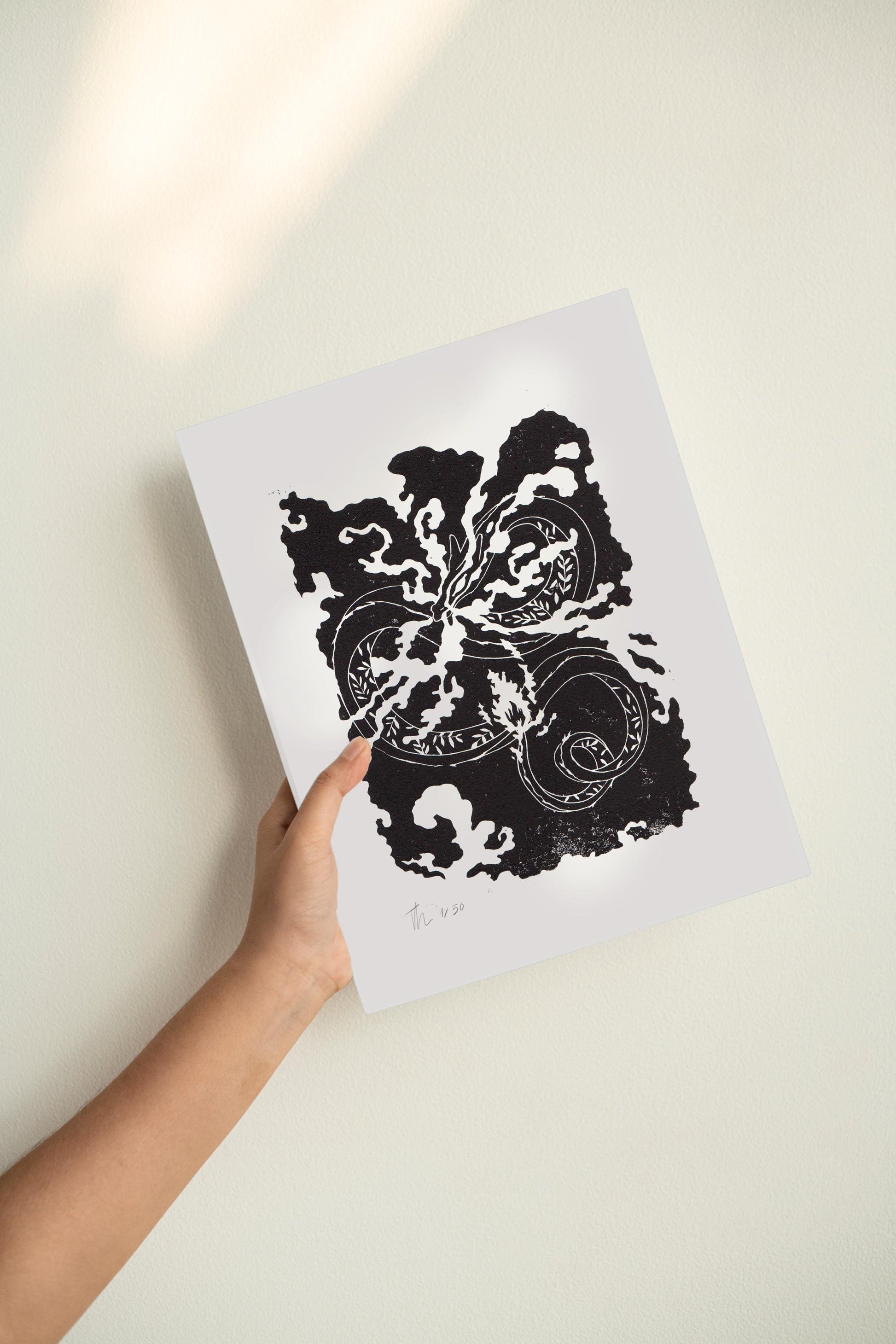 Linogravure - Dragon, nuage, fumée, fantasy, créature - linocut - print, affiche, art mural, décoration d'intérieur - édition limitée 50 ex