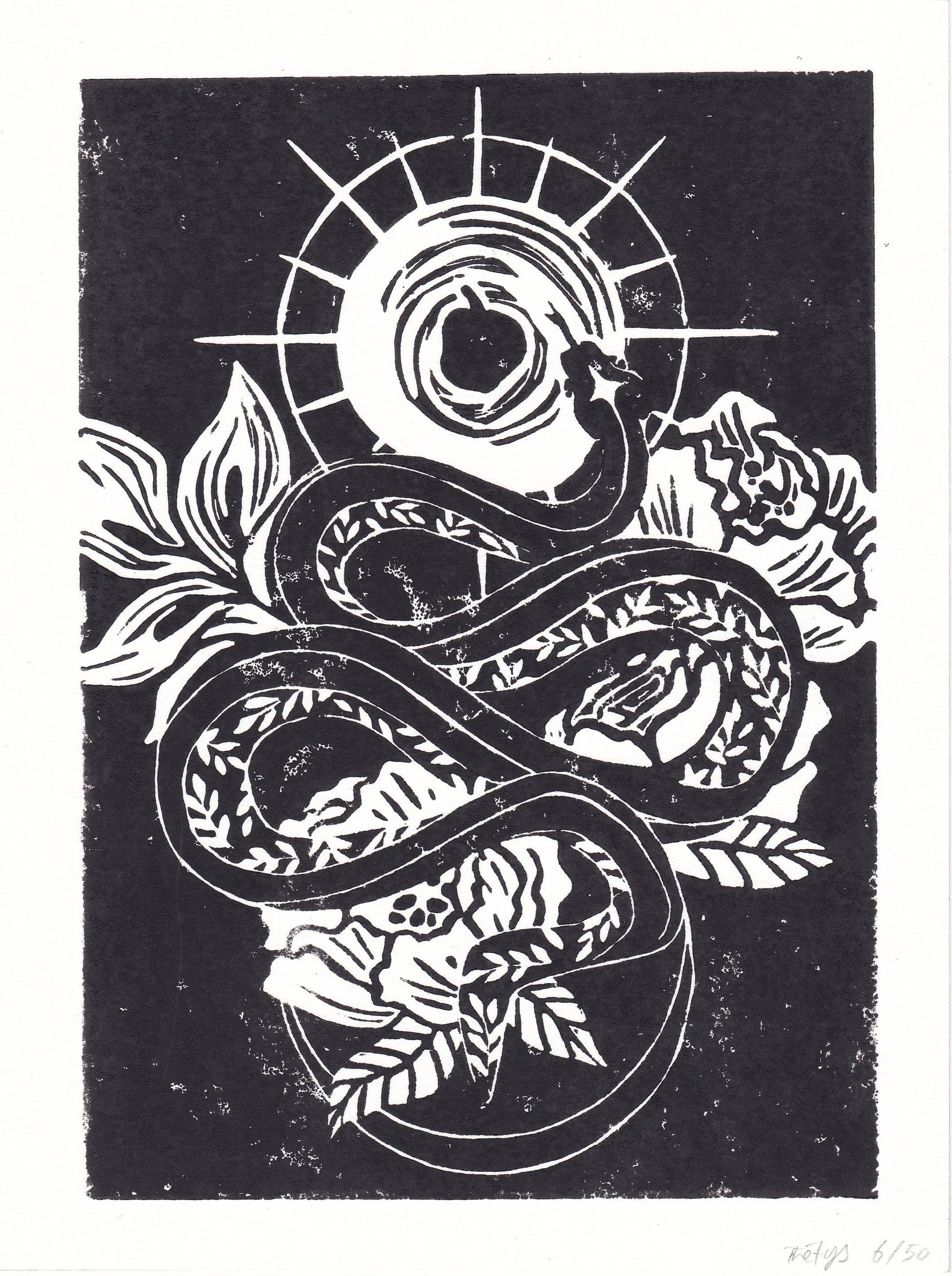 Linogravure - Tatoo serpent - linocut - print - impression à la main - édition limitée à 50 exemplaires